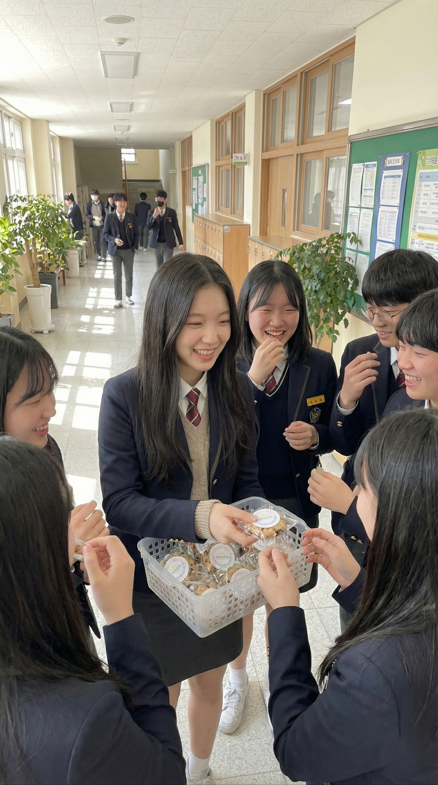 공부하느라 지친 학생들에게 가장 필요한 건 역시 당 충전이죠! 복도와 교실에서 친구들에게 쿠키를 나누어 주는 모습이 정말 보기 좋습니다.